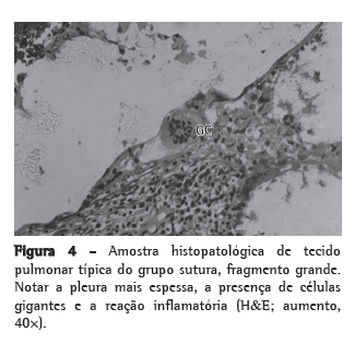 Áreas de aderência na parede torácica foram identificadas em todos os animais, sendo consideradas uma consequência natural da hipóxia causada pela incisão e pelos procedimentos empregados para se obter hemostasia. As aderências eram mais graves nos grupos SuFP e SuFG que nos grupos AdFP e AdFG. Nos dois primeiros grupos, as aderências foram atribuídas à lesão isquêmica tecidual causada pelo procedimento cirúrgico e à presença do fio de sutura absorvível. Nos dois últimos grupos, as aderências podem estar relacionadas à toxicidade dos subprodutos da degradação do cianoacrilato.(11,23) Embora a presença de resíduos tóxicos 14 dias após a cirurgia tenha sido relatada anteriormente,(21) não se encontrou nenhum resíduo do adesivo 30 dias após a cirurgia no presente estudo. As reações inflamatórias observadas durante o exame histopatológico dos fragmentos pulmonares foram mais intensas e numerosas nos animais submetidos à sutura convencional com fio absorvível. Embora também tenhamos encontrado reações inflamatórias nos animais tratados com o adesivo tecidual, elas foram menos intensas. As reações inflamatórias podem ter ocorrido em razão da toxicidade dos subprodutos da degradação do cianoacrilato e ao aquecimento intenso durante o processo de polimerização.(10,11,21) Além disso, a quantidade de tecido vascular no parênquima pulmonar deve ser levada em consideração, pois a resposta inflamatória é proporcional a ela.(20)