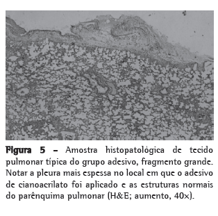Os cianoacrilatos têm sido amplamente utilizados como adesivos teciduais em cirurgias(2-5) e têm se mostrado seguros.(6-8) Seu uso como adesivo cirúrgico tem sido recomendado em razão de suas características: rápida polimerização após a aplicação e o contato com fluidos, como água e sangue, ou com tecidos úmidos. Entretanto, para a obtenção de melhores resultados de colagem, os adesivos de cianoacrilato devem ser aplicados em superfícies o mais secas possível.(6) Os primeiros cianoacrilatos desenvolvidos para procedimentos cirúrgicos eram adesivos de cadeia curta, e esse tipo de adesivo foi extensivamente estudado e consequentemente rejeitado para uso cirúrgico porque causava intensa inflamação local e reações de corpo estranho.(8) Esse tipo de adesivo de cianoacrilato é rapidamente degradado, produzindo substâncias tóxicas, como o gás cianeto e o formaldeído.(8-10) Os adesivos de cianoacrilato de cadeia longa, entretanto, têm se mostrado seguros, pois o processo de degradação é mais lento, produzindo uma quantidade menor de substâncias tóxicas. O adesivo de etil-2-cianoacrilato é um dos adesivos de cianoacrilato de cadeia longa. Entretanto, mesmo os adesivos de cianoacrilato de cadeia longa devem ser utilizados com cautela, pois podem ser tóxicos, dependendo da quantidade de adesivo utilizada e do grau de vascularização do tecido envolvido. Tecidos ricamente vascularizados podem desenvolver reações inflamatórias leves, moderadas ou graves. O uso de pequenas quantidades de adesivos de cianoacrilato não tem sido implicado em intoxicações, mesmo quando aplicadas em tecidos ricamente vascularizados.(10) Os adesivos de cianoacrilato têm sido utilizados experimentalmente e clinicamente como agentes hemostáticos tópicos em tecidos do parênquima, assim como em cirurgia oral, incisões e enxertos de pele.(4,5,11) Sendo assim, o uso do adesivo tecidual de etil-2-cianoacrilato pode ser um método alternativo para a reparação do parênquima pulmonar após lobectomia parcial.