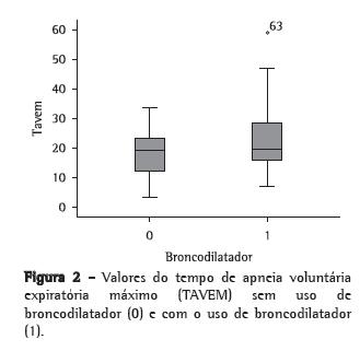 Em nosso estudo, o TAVEM foi diferente entre casos e controles tanto antes quanto após o uso de broncodilatador. Além disso, houve uma melhora importante nos valores com o uso do broncodilatador. Apesar de um estudo anterior ter sugerido que o teste de apneia não seria útil como um teste de função pulmonar,(19) vários estudos mostraram que o teste de apneia pode desempenhar um papel na avaliação da dispneia e que o uso do broncodilatador melhora os valores do TAVEM.(8-10,20-22)