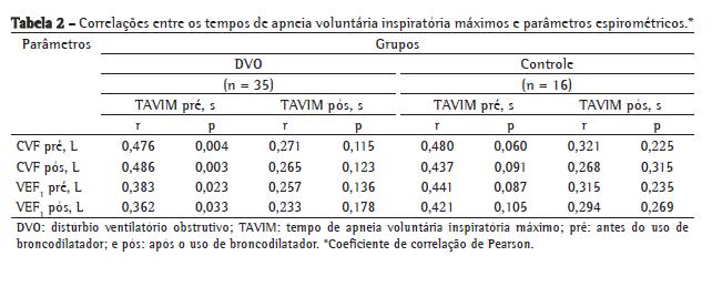 Usando correlações bivariadas, encontramos correlações significativas e positivas, no grupo DVO, do TAVIM antes do uso de broncodilatador com VEF1 em L pré-broncodilatador (r = 0,383; p = 0,023) , VEF1 em L pós-broncodilatador (r = 0,362; p = 0,033), CVF em L pré-broncodilatador (r = 0,476; p = 0,004) e CVF em L pós-broncodilatador (r = 0,486; p = 0,004). Não houve correlações significativas entre o TAVIM após o uso de broncodilatador com os parâmetros de função pulmonar no grupo. Com relação ao TAVEM antes e após o uso de broncodilatador, não houve correlações significativas com nenhum dos parâmetros de função pulmonar nos dois grupos (Tabela 2).