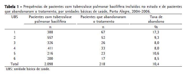 As frequências dos pacientes com tuberculose pulmonar bacilífera que abandonaram o tratamento, por UBS, encontram-se na Tabela 1. A média da taxa de abandono foi de 10,4%, não tendo sido verificadas diferenças significativas entre as UBS estudadas.