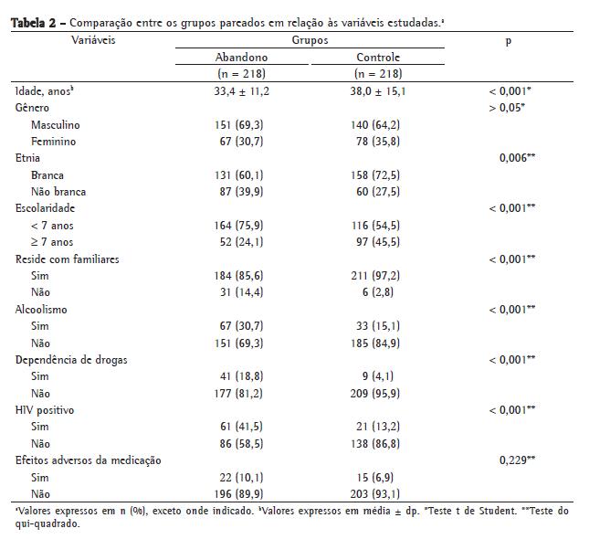 Em ambos os grupos, os pacientes eram, em sua maioria, homens e brancos, em concordância com os resultados relatados em estudo também realizado em Porto Alegre. Todavia, acompanhando a literatura,(27,28) verificou-se que um maior número de abandonos ocorreu em indivíduos de etnia não branca.