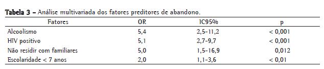 Na análise por regressão logística múltipla, o alcoolismo (OR = 5,4; IC95%: 2,5-11,2; p < 0,001), a presença de infecção pelo HIV (OR = 5,1; IC95%: 2,7-9,7; p < 0,001), o fato de não residir com familiares (OR = 5,0; IC95%: 1,5-16,9; p = 0,05) e a baixa escolaridade (OR = 2,0; IC95%: 1,1-3,6; p < 0,01) mostraram-se como fatores de risco independentes para o abandono do tratamento (Tabela 3).