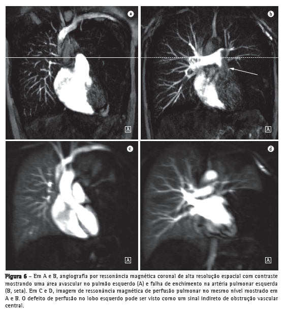 Avanços técnicos substanciais em angio-RM pulmonar foram introduzidos nos últimos anos (Figuras 5 e 6). Novas melhorias estão em andamento; dentre elas, o uso de imagens paralelas, compartilhamento de visão, angiografia do tipo time-resolved echo-shared(17-19) e perfusão pulmonar. Essas técnicas encurtaram o tempo de aquisição da angio-RM, tornaram-na menos suscetível a artefatos de movimento e melhoraram a resolução espacial. Um estudo mostrou que um protocolo combinado de RM (progressão de RM em tempo real para RM de perfusão, e desta para angio-RM) é confiável e sensível, produzindo resultados semelhantes aos obtidos com TC com multidetectores de 16 fileiras.(18)