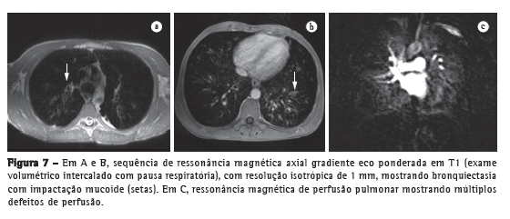Embora haja poucos relatos na literatura, a RM é amplamente utilizada como meio de rastreamento de fibrose cística e vigilância de pacientes com a doença. Estudos recentes demonstraram que a RM é altamente capaz de revelar tanto a bronquiectasia típica da fibrose cística como tampão mucoso, além de demonstraram que a RM tem valor diagnóstico igual ao da TC na avaliação da gravidade da doença por meio do sistema de pontuação de Bhalla ou de Helbich.(35)