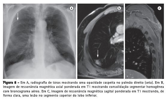 As várias características da pneumonia, como nódulos mal definidos, opacidades em vidro fosco e consolidações, podem ser facilmente detectadas e diferenciadas por meio de RM. Na radiografia de tórax, nódulos e calcificações extremamente pequenos representam grandes desafios devido à espessura do corte e à baixa intensidade do sinal. Como ferramenta de acompanhamento, recomenda-se a RM em vez da TC, a fim de evitar exposição excessiva a radiação ionizante. A Figura 8 mostra uma comparação entre uma radiografia de tórax e imagens de RM do mesmo tórax. A sensibilidade de sequências ponderadas em T2 e o potencial de sequências ponderadas em T1 realçadas por contraste podem facilitar sobremaneira o diagnóstico diferencial.(36) Além disso, complicações incipientes (como derrame pericárdico, derrame pleural, empiema e abscesso pulmonar) são facilmente reconhecidas em imagens de RM. Em pacientes imunodeprimidos, a RM é quase tão acurada quanto a TC para a detecção de anormalidades pulmonares.(8)