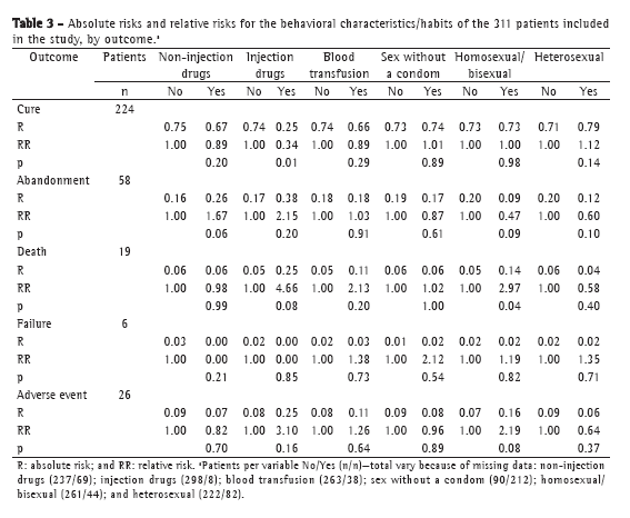 All patients included in the study received self-administered treatment and initiated therapy with the RHZ regimen, except those with formal contraindications to its use. For ART-naïve individuals living with HIV/AIDS, except for those with contraindications, a regimen containing zidovudine, lamivudine, and efavirenz was prescribed and was preferably initiated after the first 30 days of tuberculosis treatment. For patients with a history of ART, regimens containing ritonavir and saquinavir were prescribed in combination with two nucleoside analogue reverse transcriptase inhibitors, selected on the basis of the history of ART or by genotyping.(7)