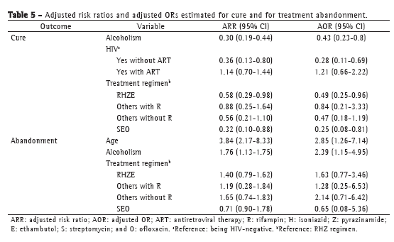 The cure rate was 72.0%. Among the 224 patients who were considered cured, there were 7 cases of recurrence, of which 6 occurred in the first semester and 1 occurred in the second semester. Absolute risks and RRs for the predictors of cure are shown in Tables 1-4. In the final model, four variables were found to reduce the probability of cure: alcoholism (ARR = 0.30); use of the SEO regimen (ARR = 0.32); HIV infection without the use of ART (ARR = 0.36); and use of the RHZ regimen+ethambutol (ARR = 0.58). Being younger-treatment abandonment increases with decreasing age-and being alcoholic both increased the probability of abandonment (ARR = 3.85 and 1.76, respectively; Table 5).