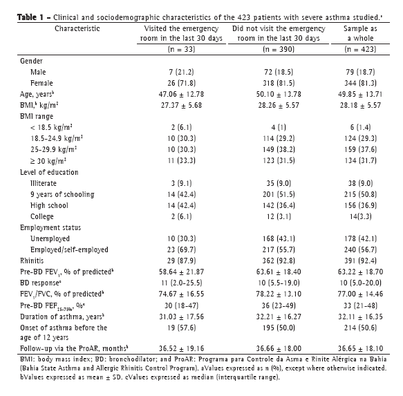 A study conducted under the auspices of the ProAR reported a good rate of adherence to treatment (i.e., > 80%).(27) All ProAR patients receive multidisciplinary follow-up and participate in monthly educational sessions, in which they are provided with information about the disease and its comorbidities, becoming more aware of their disease. In addition, at each medical visit, ProAR patients are given an action plan so that, during exacerbations, they know what to do. This reduces the need for emergency room treatment. This might explain the low frequency of emergency room visits in the month preceding the evaluation visit among the patients with severe asthma in the present study.