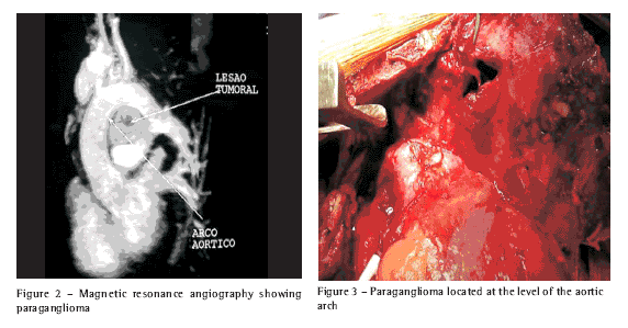 The patient was submitted to biopsy through parasternal incision with pericardial opening. A diagnosis of paraganglioma, with positivity for synaptophysin, chromogranin and S100 protein and negativity for pancreatin, was established. Scintigraphy with metaiodobenzylguanidine was negative. Arterial pressure was normal. Magnetic resonance angiography revealed the details of the paraganglioma, which was positioned amidst the aortic arch, the pulmonary artery and the right atrium (Figure 2).