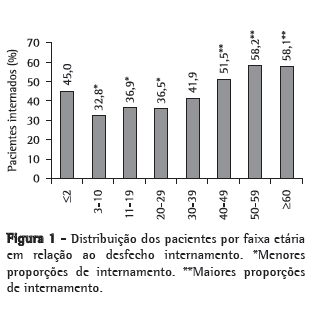 Em relação à faixa etária, 88,5% dos pacientes internados apresentavam menos de 50 anos de idade, sendo a maioria pertencente à faixa etária de 20 a 29 anos. Somente 2,8% dos pacientes internados apresentavam idade igual ou superior a 60 anos.
