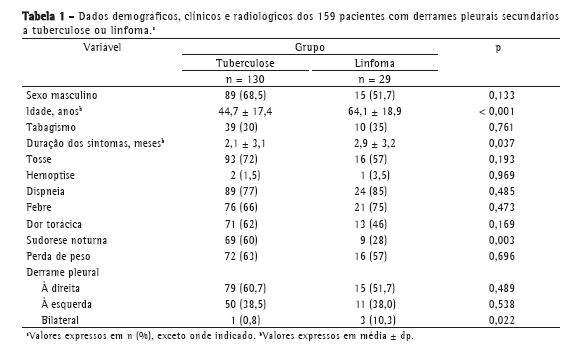A Tabela 1 mostra os dados clínicos e demográficos dos 159 pacientes (130 pacientes com tuberculose e 29 pacientes com linfoma) incluídos no presente estudo. Em ambos os grupos, houve discreta predominância do sexo masculino. A média de idade e a duração média dos sintomas foram significativamente menores no grupo tuberculose. Dentre os sintomas relatados, apenas a sudorese noturna foi significativamente mais comum no grupo tuberculose do que no grupo linfoma. Houve predominância de derrame pleural à direita, independentemente da etiologia.