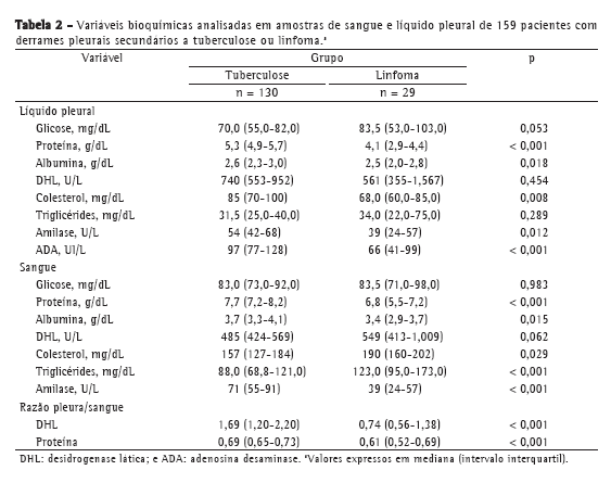 As variáveis bioquímicas analisadas são apresentadas na Tabela 2. Os níveis pleurais de proteína, albumina, colesterol e amilase foram significativamente maiores no grupo tuberculose do que no grupo linfoma. Todos os pacientes com tuberculose e 31% daqueles com linfoma apresentaram níveis pleurais de ADA maiores do que o limite superior do normal (40 U/L). Os níveis séricos de proteína, albumina e amilase foram significativamente maiores no grupo tuberculose do que no grupo linfoma, ao passo que os níveis séricos de colesterol e triglicérides foram significativamente maiores no grupo linfoma.