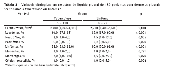 Quanto à avaliação citológica, a proporção de leucócitos e linfócitos no líquido pleural foi maior no grupo tuberculose (Tabela 3). A pesquisa de células malignas foi feita em ambos os grupos e foi negativa na maioria dos pacientes com tuberculose (96,9%); entretanto, linfócitos atípicos foram encontrados em 4 desses pacientes (3,1%). Em tais pacientes, a cultura para M. tuberculosis no tecido ou líquido pleural foi positiva e, no período de acompanhamento, houve resposta satisfatória ao tratamento específico, sem evidência de malignidade.