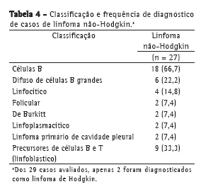 No grupo com derrame pleural secundário a linfoma, a citologia para células malignas foi positiva, altamente suspeita, e negativa em 51,8%, 24,1% e 24,1% dos pacientes, respectivamente. A biópsia pleural fechada revelou infiltrado linfomatoso em 41,4%. Em pacientes com citologia suspeita e biópsia pleural negativa, o diagnóstico de linfoma foi confirmado por meio de exame histológico e imunofenotipagem de linfócitos em outros locais além da pleura. A Tabela 4 mostra a classificação histológica/fenotípica dos casos de linfoma. Derrames pleurais associados a linfoma de Hodgkin representaram apenas 6,9% dos casos. Em casos de derrame pleural associado a linfoma não-Hodgkin, houve predominância de subtipos de células B (66,7%).