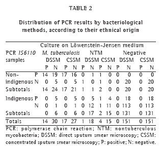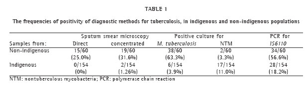 METHODSIn the year 2002, pulmonary secretions were collected from 60 non-indigenous patients and 158 indigenous patients, all of whom presented respiratory symptoms and were suspected of having pulmonary TB, residing in the state of Amazonas. A spontaneous sputum sample was collected from each patient and processed for the diagnosis of TB using bacteriological methods and PCR.