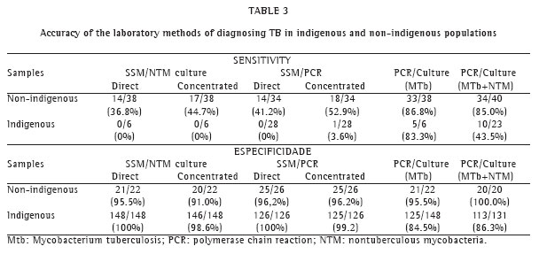 Objective: To evaluate the accuracy of bacteriological methods and of polymerase chain reaction (with primers specific for IS6110 of the Mycobacterium tuberculosis complex) in testing sputum samples from indigenous (Amerindian) and non-indigenous patients. Methods: A total of 214 sputum samples (154 from indigenous patients and 60 from non-indigenous patients) were analyzed in order to determine the accuracy of smear microscopy (direct and concentrated versions) for acid-fast bacilli, culture, and polymerase chain reaction. Results: Both microscopy methods presented low sensitivity in comparison with culture and polymerase chain reaction. Specificity ranged from 91% to 100%, the concentrated acid-fast smear technique being the least specific. Nontuberculous mycobacteria were isolated three times more frequently in samples from indigenous patients than in those from non-indigenous patients. False-positive and false-negative polymerase chain reaction results were more common in the indigenous population. Conclusion: Positivity and isolation of nontuberculous mycobacteria in the acid-fast smear in conjunction with polymerase chain reaction positivity raise the following hypotheses: nontuberculous mycobacteria species with DNA regions homologous to, or even still possessing, the M. tuberculosis IS6110 exist in the Amazon; colonization of the oropharynx or of a tuberculous lesion accelerates the growth of the nontuberculous mycobacteria present in the sputum samples, making it impossible to isolate M. tuberculosis; A history of tuberculosis results in positivity for M. tuberculosis DNA. The absence of bacteriological positivity in the presence of polymerase chain reaction positivity raises questions regarding the inherent technical characteristics of the bacteriological methods or regarding patient history of tuberculosis.