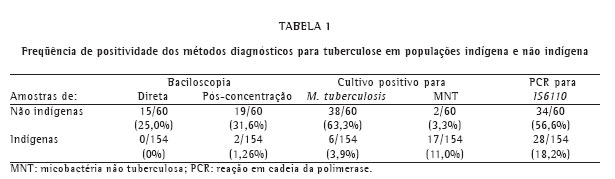 Objective: To evaluate the accuracy of bacteriological methods and of polymerase chain reaction (with primers specific for IS6110 of the Mycobacterium tuberculosis complex) in testing sputum samples from indigenous (Amerindian) and non-indigenous patients. Methods: A total of 214 sputum samples (154 from indigenous patients and 60 from non-indigenous patients) were analyzed in order to determine the accuracy of smear microscopy (direct and concentrated versions) for acid-fast bacilli, culture, and polymerase chain reaction. Results: Both microscopy methods presented low sensitivity in comparison with culture and polymerase chain reaction. Specificity ranged from 91% to 100%, the concentrated acid-fast smear technique being the least specific. Nontuberculous mycobacteria were isolated three times more frequently in samples from indigenous patients than in those from non-indigenous patients. False-positive and false-negative polymerase chain reaction results were more common in the indigenous population. Conclusion: Positivity and isolation of nontuberculous mycobacteria in the acid-fast smear in conjunction with polymerase chain reaction positivity raise the following hypotheses: nontuberculous mycobacteria species with DNA regions homologous to, or even still possessing, the M. tuberculosis IS6110 exist in the Amazon; colonization of the oropharynx or of a tuberculous lesion accelerates the growth of the nontuberculous mycobacteria present in the sputum samples, making it impossible to isolate M. tuberculosis; A history of tuberculosis results in positivity for M. tuberculosis DNA. The absence of bacteriological positivity in the presence of polymerase chain reaction positivity raises questions regarding the inherent technical characteristics of the bacteriological methods or regarding patient history of tuberculosis.
