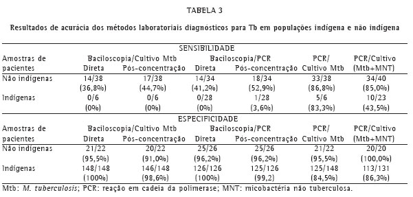 Em relação aos resultados dos testes diagnósticos para Tb, a ausência de baciloscopia direta positiva para bacilos álcool-acidorresistentes em indígenas (Tabela 1) confirma a baixa sensibilidade desta técnica na referida população, seja ela executada na própria área indígena(2) ou mesmo quando as amostras clínicas são transportadas para laboratório especializado,(14) como no presente estudo.