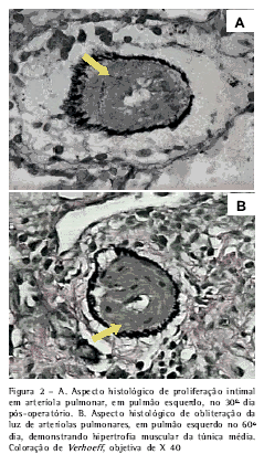 Assim, em modelo experimental de arteriopatia pulmonar pós-obstrutiva, através da mensuração da resposta arterial pulmonar podem-se estabelecer padrões de remodelação, ao longo do tempo(7). Fatores etiológicos possivelmente envolvidos no tromboembolismo pulmonar crônico, como a ocorrência das anastomoses entre o sistema brônquico e o pulmonar(8), a injúria endotelial isquêmica(8) e as variações de fluxo sangüíneo pelo sistema arterial (9), poderão ser associados a esses padrões de resposta.