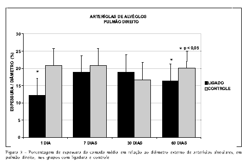 Particularmente, o diâmetro externo das arteríolas distais (alveolares) aumentou em todos os períodos, com redução progressiva do diâmetro interno após o 7o dia, já que apresentaram aumento progressivo na porcentagem de espessura (Figura 4).