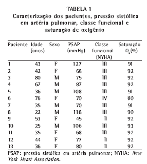 O questionário SF36 foi aplicado em treze pacientes no pré-operatório, e em média 8,1 meses depois da operação, respeitando-se sempre um período mínimo de três meses de intervalo após o procedimento cirúrgico. Sete indivíduos eram do sexo feminino e seis do masculino. A idade média dos pacientes foi de 45,7 + 18,3 anos, e no grupo de indivíduos normais de 45,7 ± 17,0 anos. Nenhum dos pacientes fumou nos doze meses que precederam a cirurgia. Todos apresentavam hipertensão pulmonar, 9 (69%) estavam em classe funcional III da New York Heart Association e todos tinham saturação de oxigênio reduzida (Tabela 1). As variáveis capacidade funcional, aspectos físicos, dor, estado geral de saúde, vitalidade, aspectos sociais e aspectos emocionais melhoraram no pós-operatório. Entretanto, não houve mudança no domínio da saúde mental (p = 0,087) (Tabela 2).