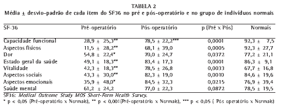 Comparando-se os resultados de qualidade de vida obtidos no pós-operatório com o grupo de indivíduos normais, cujos valores também estão mostrados na Tabela 2, observou-se que os resultados encontrados foram semelhantes (p > 0,05) em todos os quesitos avaliados, exceto quanto à capacidade funcional. Quando comparados os valores obtidos no pré-operatório com o grupo de indivíduos normais, houve diferença estatística em todos os domínios, exceto no da saúde mental (p < 0,05).