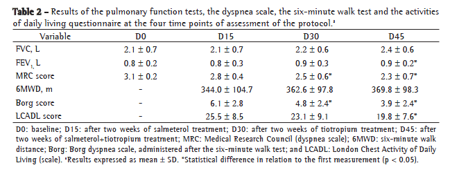 Subsequently, patients underwent simple spirometry, in which the procedures followed were those recommended in the guidelines established by the Brazilian Thoracic Association (BTA),(13) and completed the MRC questionnaire in order to determine the degree of dyspnea, confirming patient eligibility for the protocol. All participating patients gave written informed consent. At the end of the visit, each patient received a prescription for salmeterol (50 µg every 12 h) and taught how to use the device. Since all the patients selected should be regularly using a long-acting inhaled β2 agonist (formoterol or salmeterol), the first 15 days were a run-in period whose only aim was to standardize the bronchodilator treatment.