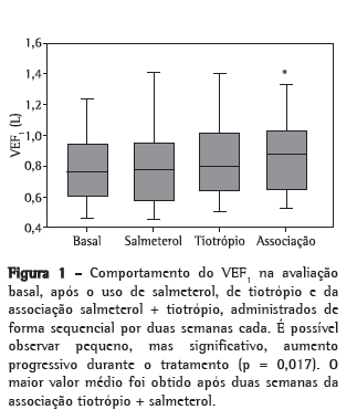 Poucos estudos avaliaram a eficácia da associação de β2-agonistas e tiotrópio a curto prazo. Nos dois trabalhos anteriormente citados,(20,21) a resposta espirométrica às drogas combinadas foi superior àquela com as medicações isoladas.