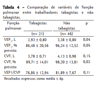 A Tabela 4 apresenta a comparação dos parâmetros de função pulmonar dos trabalhadores segundo o hábito tabágico. A partir desses dados, foi possível perceber que o tabagismo estava associado a uma piora na função pulmonar dos trabalhadores de carvoarias, uma vez que o grupo de tabagistas possuía uma redução significativa nos valores de CVF e de VEF1.