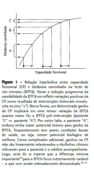 O TC6 também pode ser utilizado ao longo do tempo para se observar objetivamente a progressão da perda funcional ou o potencial efeito positivo de intervenções terapêuticas ou reabilitadoras. A interpretação das variações da DTC6 é ainda mais complexa, haja vista a ampla variabilidade dos valores sugeridos para a minimal important difference (MID, diferença mínima importante), ou seja, "a menor diferença em um desfecho de interesse que pacientes percebam como importante e que levem o paciente, ou seu médico, a considerar uma mudança de conduta".(7) Na DPOC, por exemplo, a MID para a DTC6 varia amplamente tanto em valores absolutos (desde 25 m até 80 m) como relativos (de 10% a 40%).(7-11) Considerações metodológicas à parte, muito dessa variabilidade pode provir da constatação de que a relação entre a DTC6 e a capacidade funcional não é linear. Na verdade, como demonstrado na Figura 1, ela é curvilinear (hiperbólica), com redução progressiva da sua inclinação com o aumento de ambas as variáveis. Isso implica que um paciente na faixa A da Figura 1, com pequena DTC6 e baixa capacidade funcional, tenha um maior espaço para ganho do que um paciente na faixa C na mesma figura, com elevada DTC6 e capacidade funcional próxima ao seu teto. Por outro lado, um mesmo ganho absoluto (em metros) será uma fração muito maior do valor basal para o paciente da faixa A do que para o paciente da faixa C (Figura 1). Adicionalmente, ainda falta uma clara noção se essa relação permanece hiperbólica e com a mesma curvatura quando há perda funcional. Poderíamos assumir que uma dada redução absoluta e relativa da DTC6 representa essencialmente o mesmo declínio da capacidade funcional que seria esperado caso ambos os valores tivessem aumentado? Futuros estudos devem abordar tais aspectos, e, no momento, a melhor alternativa talvez seja reconhecer que a MID para a DTC6 provavelmente dependa da DTC6 basal (ou de pré-intervenção): menor para os pacientes mais graves, maior (ainda que mais difícil de ser atingida) para os menos graves (Figura 1).
