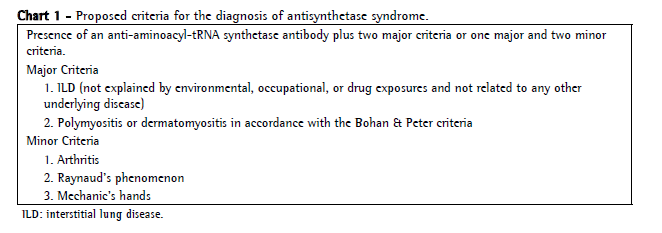 of clinical and biochemical features. Key features for diagnosis include the presence of an anti-ARS antibody, accompanied by myositis, ILD, or both. Although arthritis, mechanic's hands, and Raynaud's phenomenon support the diagnosis, their presence is not necessary. In Chart 1, we propose diagnostic criteria for AS syndrome.
