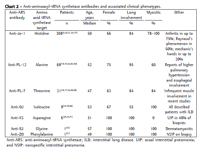 37. Schmidt WA, Wetzel W, Friedländer R, Lange R, Sörensen HF, Lichey HJ, et al. Clinical and serological aspects of patients with anti-Jo-1 antibodies--an evolving spectrum of disease manifestations. Clin Rheumatol. 2000;19(5):371-7.