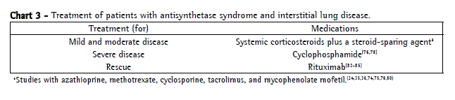 Our usual approach to therapy for PM/DM-related ILD (including patients with AS syndrome) is to use a combination of glucocorticoids and a steroid-sparing agent (usually mycophenolate mofetil or azathioprine). We use cyclophosphamide for cases with clinically severe or rapidly progressive ILD. For patients in whom ILD worsens despite aggressive conventional therapy, rituximab has been used with moderate success,(83,84) with the stabilization or improvement of 7 of the 11 patients evaluated in one case series (Chart 3).(85)