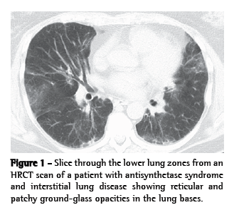 A pattern of nonspecific interstitial pneumonia (NSIP), with or without areas of consolidation (suggestive of organizing pneumonia), is usually revealed on HRCT scans. A usual interstitial pneumonia (UIP) pattern can also be seen.(30,36) In our experience, many patients present with a distinct pattern that is highly suggestive of AS syndrome-related ILD. In this pattern, there are (predominantly basilar) reticular and ground-glass opacities, accompanied by a loss of lung volume, traction bronchiectasis, and scattered (usually peribronchovascular) areas of consolidation (Figure 1).(52)