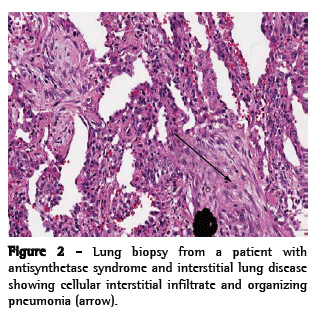 Em pacientes com miosite, é comum o comprometimento pulmonar, e a presença de anticorpos anti-aminoacil-RNAt sintetase (anti-ARS) é preditora da presença ou do desenvolvimento de doença pulmonar intersticial (DPI). Uma entidade clínica distinta - a síndrome antissintetase - é caracterizada pela presença de anticorpos anti-ARS, miosite, DPI, artrite, fenômeno de Raynaud e "mãos de mecânico". O mais comum anticorpo anti-ARS é o anti-Jo-1. Anticorpos anti-ARS mais recentemente descritos podem conferir um fenótipo que é distinto daquele de pacientes com positividade para anti-Jo-1, sendo caracterizado por uma menor incidência de miosite e uma maior incidência de DPI. Nos pacientes com DPI relacionada à síndrome antissintetase, a resposta a medicações imunossupressoras é em geral favorável.
