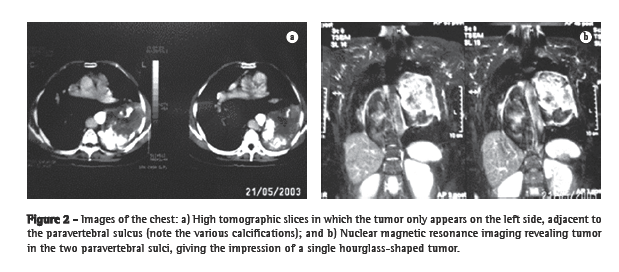 Case reportA 51-year-old Caucasian female homemaker, born in the city of Marília and a resident of the city of São Paulo (both located in the state of São Paulo), reported nonproductive cough, accompanied by pharyngeal and retrosternal pruritus, for three months. She also reported weight loss (2 kg) in the last two months. The patient described herself as a nonsmoker and reported no other lung diseases. The physical examination revealed that the patient, who was of average build, presented good general health status and normal hemodynamics. Pulmonary auscultation revealed bilateral breath sounds, which were reduced in the upper third of the left hemithorax, reduced vocal fremitus, underlying fluid density upon percussion, and reduced bronchophony, also in the upper third of the left hemithorax, without adventitious sounds. An anteroposterior X-ray (Figure 1a) revealed that, in two-thirds of the left hemithorax, there was opacity, which extended to the cardiac silhouette, suggesting that the tumor was located anterior to the ascending aorta. In a lateral X-ray (Figure 1b), the image was suggestive of a tumor in the paravertebral sulci, extending posteriorly to the heart. A tomography scan of the chest (Figure 2a) revealed a mass in the left paravertebral sulcus, extending to the right paravertebral sulcus, with central and peripheral calcifications. In order to plan the surgical procedure, we continued the investigation using magnetic resonance imaging (Figure 2b), which revealed a mass in the left paravertebral sulcus, extending to the right paravertebral sulcus, and maintaining cleavage planes with the adjacent structures. A transparietal puncture biopsy was carried out, and a diagnosis of liposarcoma was made. Resective surgery was then indicated. A left posterior lateral thoracotomy was performed in the fourth intercostal space. We dissected a tumor located posteriorly to the heart, anteriorly to the aorta, and to the right of the esophagus, with loose adhesions to the structures mentioned, and it was possible to remove the entire tumor through a left thoracotomy and through the opening in the mediastinal pleurae. Smaller tumors were dissected from the left paravertebral sulcus. Subsequently, chest tubes were inserted, and the incision was closed in layers. The drains were removed on postoperative day 3, and the patient was discharged on postoperative day 5. In the macroscopic and anatomopathological examination, the largest sample was seen to have an hourglass shape and found to weigh 994 g, with two lobes: one globular, 10 cm in diameter, firm, whitish, and fasciculated with gelatinous areas; and the other irregular in shape, measuring 14 × 9 × 8 cm, and yellowish upon dissection. An additional eight samples, irregular in shape and weighing 234 g altogether, were examined. Each was partially covered by a smooth and glossy membrane, with foci of hemorrhage, and, upon dissection, was yellow with whitish streaks and firm. In some cases, there was a bony consistency. Microscopy (Figure 3) revealed immature mesenchymal neoplasia characterized by the proliferation of anaplastic spindle cells with numerous atypical mitoses and bizarre multinucleated giant cells. The remaining samples consisted of proliferation of adipocytes, forming lobes amidst streaks of fibrosis and containing anaplastic cells with dense, strong chromatin staining. We concluded that it was a case of well-differentiated liposarcoma (lipoma-like) and dedifferentiated liposarcoma. The patient received adjuvant chemotherapy and underwent outpatient follow-up treatment for 3 years without recurrence.