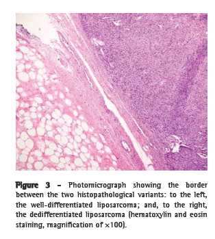 These tumors can present as well-differentiated neoplasms with a pseudocapsule, which makes it difficult to characterize malignancy, and it is necessary to analyze all of the surgical samples in search of cellular atypias. However, they can manifest as high-grade tumors, which makes prognosis poor. They are divided into histopathological subtypes that behave differently, and the dedifferentiated liposarcoma is the most aggressive variant, being accompanied by cytogenetic abnormalities and many cellular atypias, including with other mesenchymal components, such as the cartilaginous and the muscular one.(3,4,10)