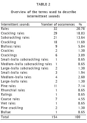 Table 1 shows the description of continuous sounds in pulmonary auscultation. There were 6 different terms used, totaling 266 occurrences. Sibilos (wheezing) was the term most often used (in 36.1% of the occurrences), followed by sibilância (sibilance, in 26.3%), and roncos (rhonchi, in 19.2%). As for the intermittent sounds, there were 154 occurrences of 20 different terms (Table 2). Estertores (rales) accounted for 20.7% of the occurrences, followed by estertores crepitantes (crackling rales, accounting for 18.8%), and estertores subcrepitantes (subcrackling rales, accounting for 13.7%).