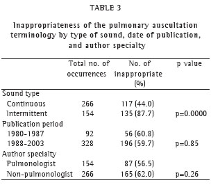 Table 3 shows the inappropriateness of the terminology used to report the pulmonary auscultation, organized by the type of sound, the publication period, and the specialty of the author. A higher percentage of inappropriateness was observed for the terms used to describe intermittent sounds than for those used to describe continuous sounds (87.7% vs. 44%, p = 0.0000). There was no significant difference between the 1980-1987 period and the 1988-2003 period in the inappropriateness of the terms used to describe adventitious sounds (60.8% vs. 59.7%, p = 0.85). Nor were any significant differences observed between pulmonologists and physicians engaged in other specialties (56.5% vs. 62%, p = 0.26).