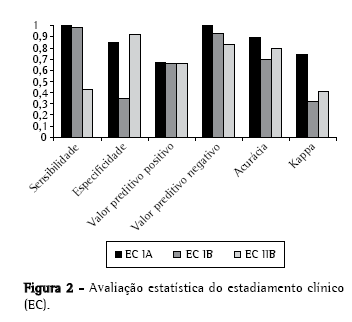 A sensibilidade para o estádio IB foi de 98%, com uma especificidade baixa de 35%, valor preditivo positivo de 66% e valor preditivo negativo de 93%. A acurácia foi de 70% e o índice de kappa, de 0,33.