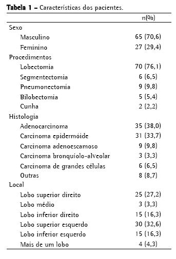 Resultados Na série de 92 pacientes estudados, 70,6% eram do sexo masculino e 29,4%, do sexo feminino, com uma idade média de 63,2 anos e mediana de 67 anos. A Tabela 1 mostra que o procedimento cirúrgico mais comumente realizado foi a lobectomia pulmonar (76,1%), seguido pela pneumonectomia, segmentectomia regrada, bilobectomia e ressecção em cunha. O tipo histológico predominante foi o adenocarcinoma em 38% dos casos, seguido pelo carcinoma epidermóide em 33,7% dos casos. A maioria das neoplasias tinha localização no lobo superior esquerdo em 32,6% e no lobo superior direito em 27,5% dos pacientes.