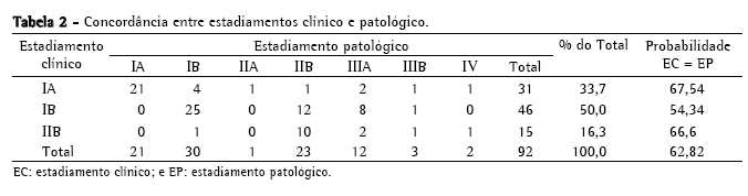 índice kappa foi utilizado para determinar a concordância entre os estadiamentos clínico e patológico. Resultados: Dentre os 92 pacientes