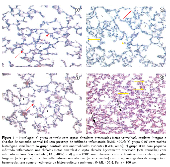 No grupo controle foi possível observar os septos alveolares preservados e capilares íntegros com alvéolos de tamanho normal sem presença de infiltrado inflamatório (Figura 1a). No grupo O10',observamos um padrão histológico muito semelhante ao grupo controle, sem anormalidades evidentes (Figura 1b). Entretanto, no grupo O30' foi possível observar algumas células inflamatórias nos alvéolos e septo alveolar ligeiramente espessado, com infiltrado inflamatório evidente (Figura 1c). Apesar dessas alterações, o padrão de histoarquitetura pulmonar não estava alterado. No grupo O90' foi evidente o extravasamento de hemácias dos capilares, septos túrgidos e grande quantidade de células inflamatórias nos alvéolos (Figura 1d). A imagem é sugestiva de congestão e hemorragia sem comprometimento da histoarquitetura pulmonar.
