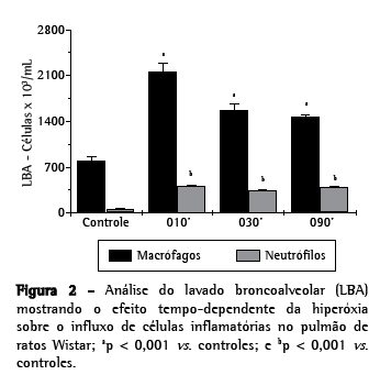 Foi observado um aumento no número de macrófagos alveolares (103/mL) no grupo O10' (216,9 ± 118,7), que foi reduzido no grupo O30' (1560,5 ± 107,4) e O90' (1467,6 ± 39,3), em comparação ao grupo controle (781,32 ± 78,3). Além disso, os grupos expostos ao oxigênio foram estatisticamente diferentes do grupo controle com p < 0,001 (Figura 2). Quanto ao número de neutrófilos, verificou-se que um aumento constante nos grupos O10' (396,3 ± 35,4), O30' (338,4 ± 17,6) e O90' (388,7 ± 11,7) em comparação ao grupo controle (61,6 ± 4,2) com p < 0,001 para todos os grupos expostos ao oxigênio (Figura 2).