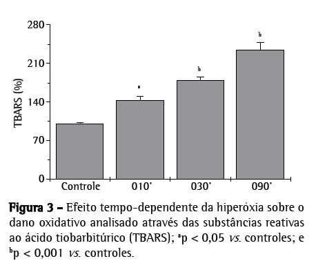 A patogênese da lesão induzida por hiperóxia no pulmão não é bem compreendida, mas acredita-se ser mediada pelos danos diretos à célula através da geração de espécies reativas de oxigênio.(27,28) É geralmente aceito que a produção aumentada das espécies reativas de oxigênio inicia um papel importante na lesão do pulmão durante a exposição à hiperóxia.(29) Dano oxidativo pode ser evidenciado por peroxidação de lipídeos no pulmão através das TBARS.(30) Um estudo apresentou aumento pronunciado na concentração de TBARS (146,0 ± 62,0nmol/mL) em ratos expostos àhiperóxia comparado à normóxia (35,0 ± 14,0 nmol/mL) e a oferta de O2 a 60% (31,0 ± 17,0 nmol/mL).(29) Observamos que ratos Wistar expostos à hiperóxia por 10, 30 ou 90 min têm um aumento do dano oxidativo analisado através do TBARS e essa resposta é progressiva de acordo com o tempo de exposição. O dano oxidativo máximo observado no grupo O90' é compatível com a densidade de volume de leucócitos, lembrando que, nesse caso, essa resposta poderia ser explicada também pelo acúmulo de leucócitos no septo alveolar. Não foi possível determinar quais espécies reativas de oxigênio estavam envolvidas na produção do dano oxidativo, mas acreditamos que o O2 possa ter um papel crucial.