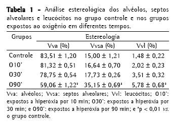Os resultados da estereologia estão apresentados na Tabela 1. Não foram observadas alterações entre a densidade de volume dos alvéolos, septos alveolares e leucócitos entre o grupo controle (83,51 ± 1,20%, 15 ± 1,21% e 1,48 ± 0,22%) e os grupos O10' (81,32 ± 0,51%, 16,64 ± 0,70% e 2,02 ± 0,23%) e O30' (78,75 ± 0,54%, 17,73 ± 0,26% e 3,51 ± 0,32%). Entretanto, no grupo O90' observamos uma diminuição (p < 0,01) na densidade de volume dos alvéolos (59,06 ± 1,22%) concomitante a um aumento (p < 0,01) na densidade de volume dos septos alveolares (35,15 ± 0,69%) em comparação ao grupo controle, assim como aumentou (p < 0,01) também a densidade de volume dos leucócitos (5,78 ± 0,68%).