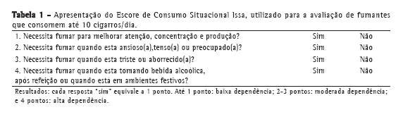 A dependência a nicotina é avaliada através do teste de Fagerström.(1) No entanto, o PAF possui um escore de avaliação complementar para ser aplicado quando o consumo de tabaco for igual ou menor que 10 cigarros, identificado como Escore de Consumo Situacional Issa (Tabela 1). A criação desse instrumento foi necessária porque as diretrizes atuais de tratamento do tabagismo(2) recomendam o uso de medicamentos antitabágicos somente para fumantes de mais de 10 cigarros/dia. No entanto, o comportamento do fumante tem mudado em função das medidas de proteção ao fumante passivo, que restringem o uso de tabaco em ambientes sociais. Com isso, tornou-se cada vez mais frequente nos depararmos com fumantes que consomem menos de 10 cigarros/dia,(3) mas sem necessariamente indicar baixa dependência a nicotina. A existência de um instrumento que consiga identificar fumantes com baixo consumo, mas possivelmente com grau de dependência a nicotina moderada ou elevada, cria a possibilidade de considerar a prescrição de fármacos antitabágicos para facilitar o processo de cessação nesse subgrupo de pacientes.