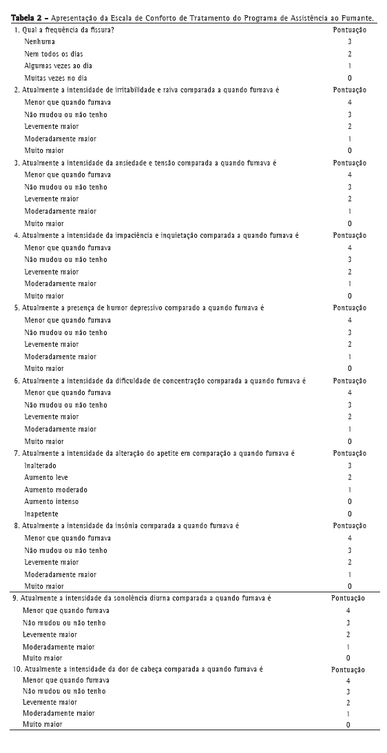 Existem inúmeros instrumentos para o diagnóstico da síndrome de abstinência de nicotina,(5,6) assim como escalas que avaliam a presença e intensidade desses sintomas em pacientes que param de fumar.(7) No entanto, nenhuma escala foi desenvolvida para avaliar o desempenho dos fármacos antitabágicos durante o tratamento da síndrome de abstinência a nicotina. Nesse contexto, foi concebida a Escala de Conforto PAF, que avalia o conforto do paciente com o tratamento proposto através de 10 itens, com pontuação de 0 a 38, na qual os valores 0 e 38 indicam maior desconforto e maior conforto, respectivamente (Tabela 2). A justificativa para a aplicação da Escala de Conforto PAF é que o uso dos medicamentos antitabágicos pode aliviar e modificar a intensidade dos sintomas de abstinência a nicotina, além de poder produzir eventos adversos que possam diretamente influenciar no tratamento. Nenhuma escala anterior avaliou a interferência das drogas antitabágicas nos sintomas de abstinência a nicotina. A escala PAF, aplicada ao longo do tratamento, compara a condição de quando o paciente fumava com a situação atual, permitindo a avaliação contínua da condição de adaptação do paciente à abstinência e a influência das condutas adotadas, sempre buscando o melhor conforto do paciente ao longo do tratamento. O uso clínico dessa escala permitiu que observássemos a necessidade de rever a conduta terapêutica quando o paciente apresentava resultados abaixo de 20. Vale ressaltar que a pontuação 20 é obtida quando a intensidade dos 10 itens avaliados está alterada de maneira leve, ou seja, o paciente tem um leve desconforto, mas a intensidade não é limitante (moderada) ou incapacitante (intensa). Deste modo, o uso da escala PAF permitiu quantificar a intensidade do conforto com o tratamento executado, e isso pode repercutir diretamente no resultado obtido.