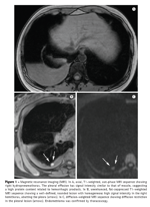 In recent years, MRI of the chest has progressed markedly. Because of improvements in speed and image quality, MRI is now ready for routine clinical use.(7-9) In both of the cases presented here, chest MRI revealed hydropneumothorax and well-defined, rounded nodules on the pleural surface in the right hemithorax. In Case 1, the pleural effusion had intermediate signal intensity on T1-weighted images, suggesting high protein content, probably related to hemorrhagic products. In Case 2, the pleural effusion had high signal intensity, suggesting recent hemothorax. The pleural nodules observed in Case 1 showed homogeneously high signal intensity on fat-suppressed T1-weighted images and restricted diffusion on diffusion-weighted imaging (DWI). In Case 2, the nodules showed heterogeneous signal intensity on T1- and T2-weighted images, without diffusion restriction. As in pelvic endometriosis,(1,10) pleural nodules of thoracic endometriosis might show different signal intensity on T1- and T2-weighted images, as well as variable diffusion restriction, depending on the age of the lesion.